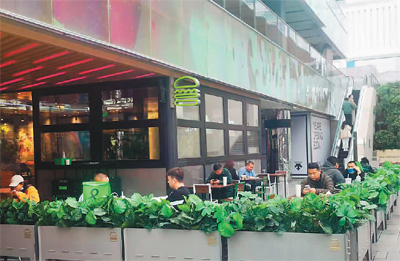 3月21日,北京市三里屯某商铺门口,人们在就餐聊天。苏明辰摄