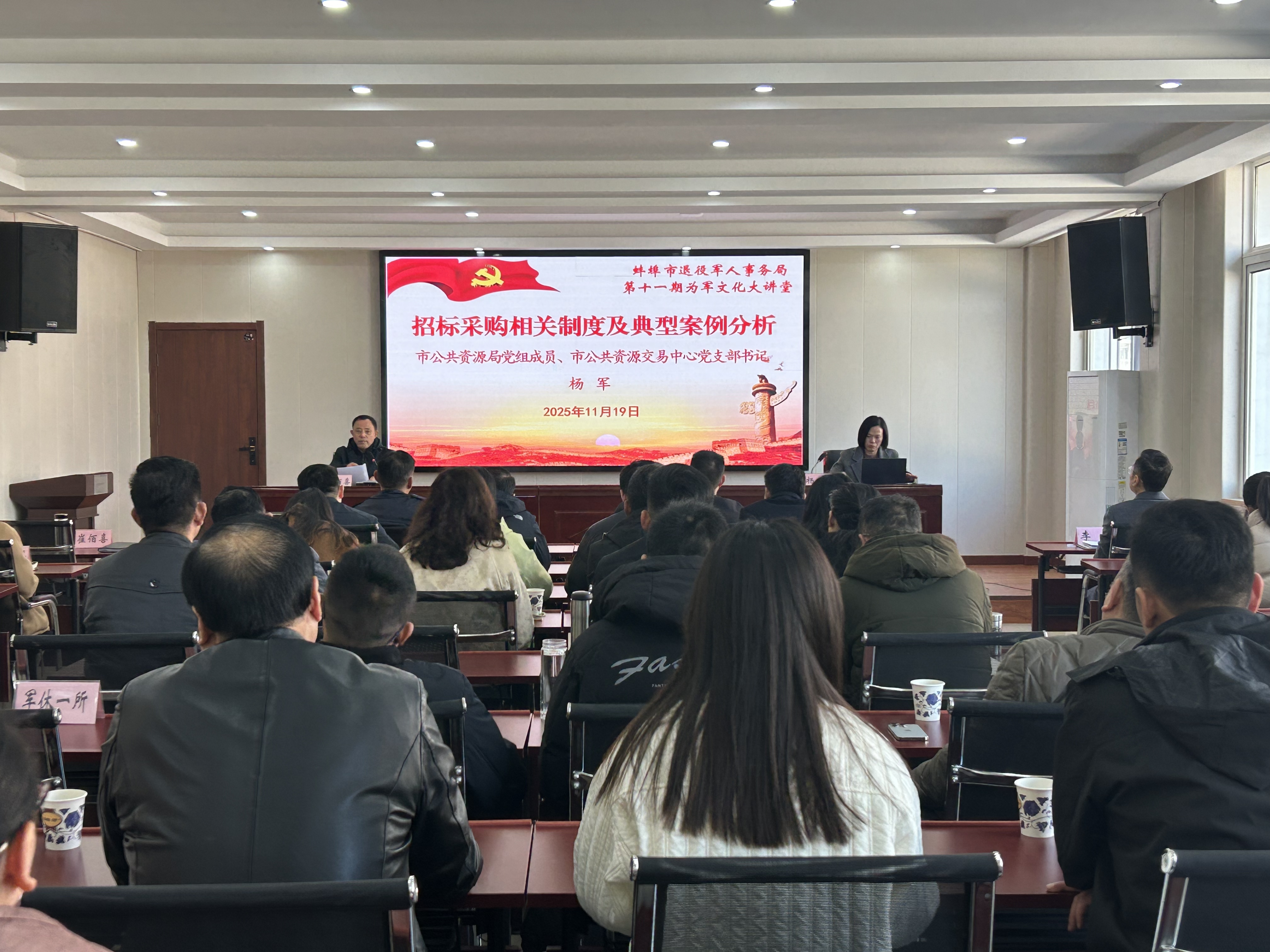 11月19日,蚌埠市退役军人事务局举办第十一期“为军文化大讲堂”,邀请市公共资源局党组成员、市公共资源交易中心党支部书记杨军同志,就招标采购相关制度及典型案例进行专题授课。