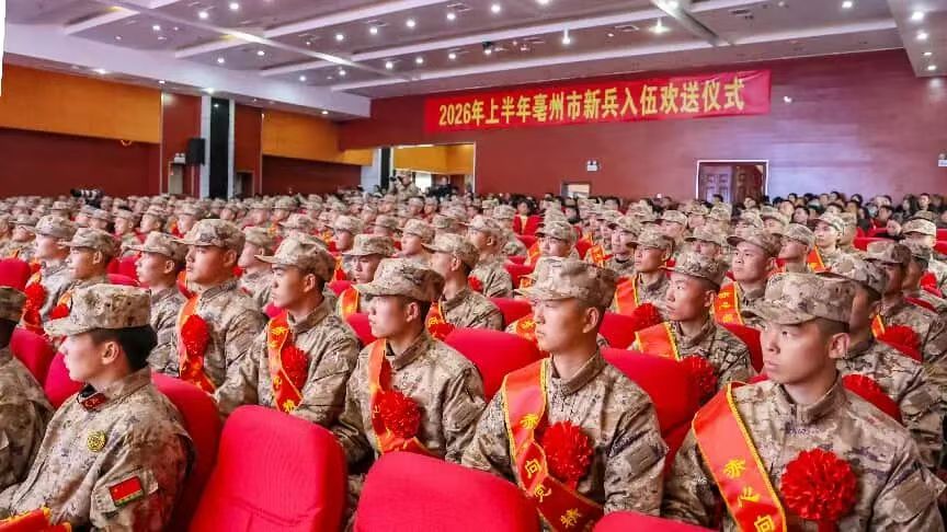 3月17日,亳州市2026年上半年新兵入伍欢送仪式在亳州学院图书馆报告厅举行。亳州市军地领导、亳州市拥军协会、新兵家长等出席欢送仪式。