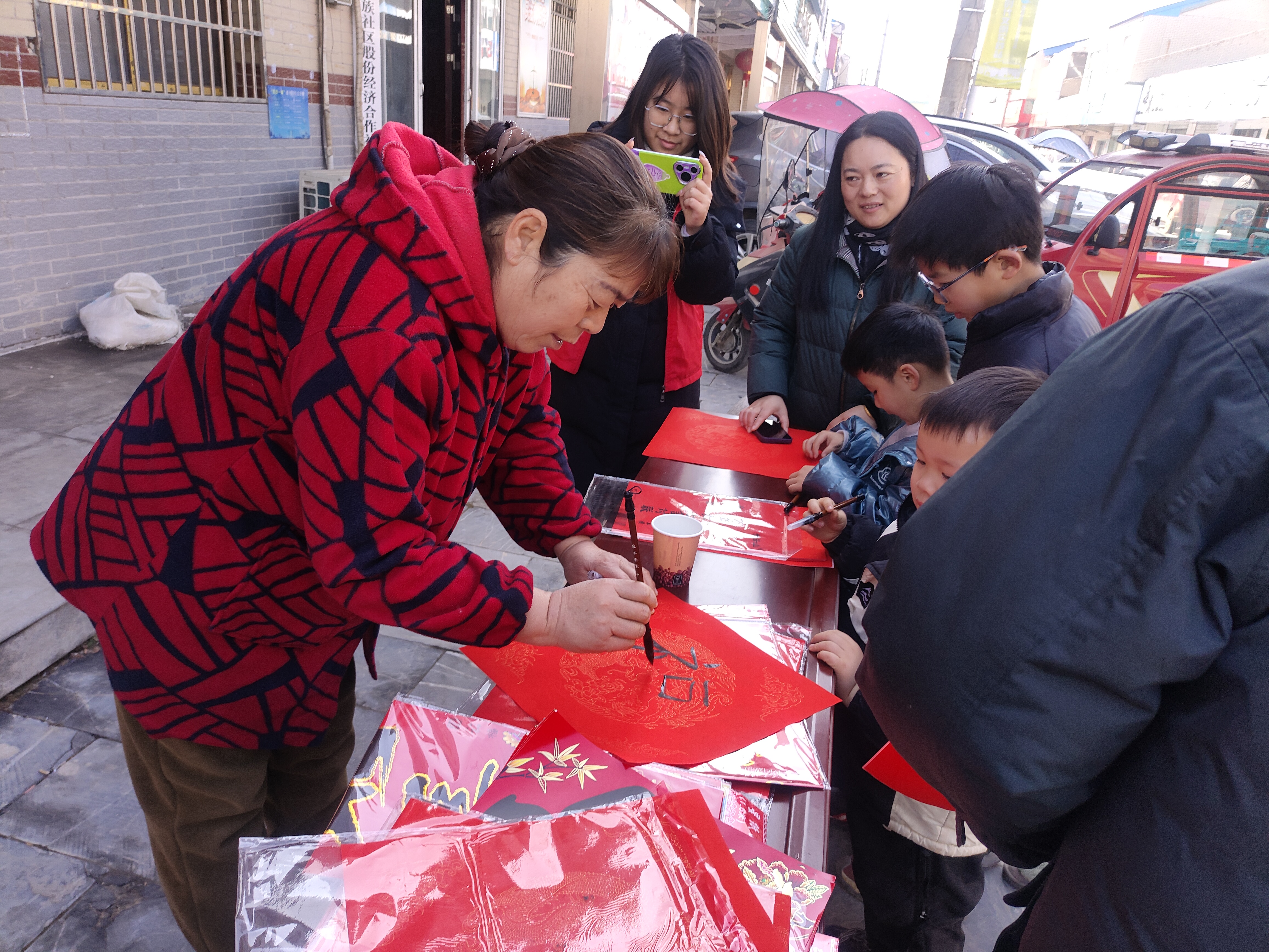 2月4日,在肥西县高店镇长镇回族社区党群服务中心门前年味扑面而来,“挥笔送福迎新岁”主题活动火热展开。活动不仅邀请书法能手现场献艺,更鼓励居民亲自提笔,在翰墨清香中迎新春。
