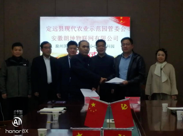 11月18日,定远县安徽滁州国家农业科技园•朗坤农科园项目签约仪式举行。该项目由安徽朗坤物联网有限公司投资建设,项目占地120亩,总投资6000万元。县党组成员、县现代农业示范园党工委书记柏传永、县审计局局长陈泽民、安徽朗坤物联网有限公司运营总监崔国斌、规划部部长张雯婷以及县农业示范园管委会副主任王家东、西卅点镇镇长崔劲松等出席了签约仪式。