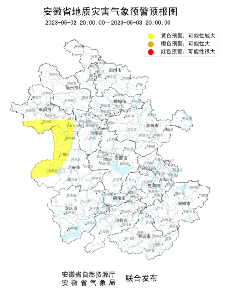 5月2日20时至5月3日20时,阜阳市的临泉县、阜南县、颍上县,六安市的叶集区、裕安区、金寨县、霍邱县请注意防范,并加强隐患巡查和排查,一旦发现隐患,提前避险转移群众。