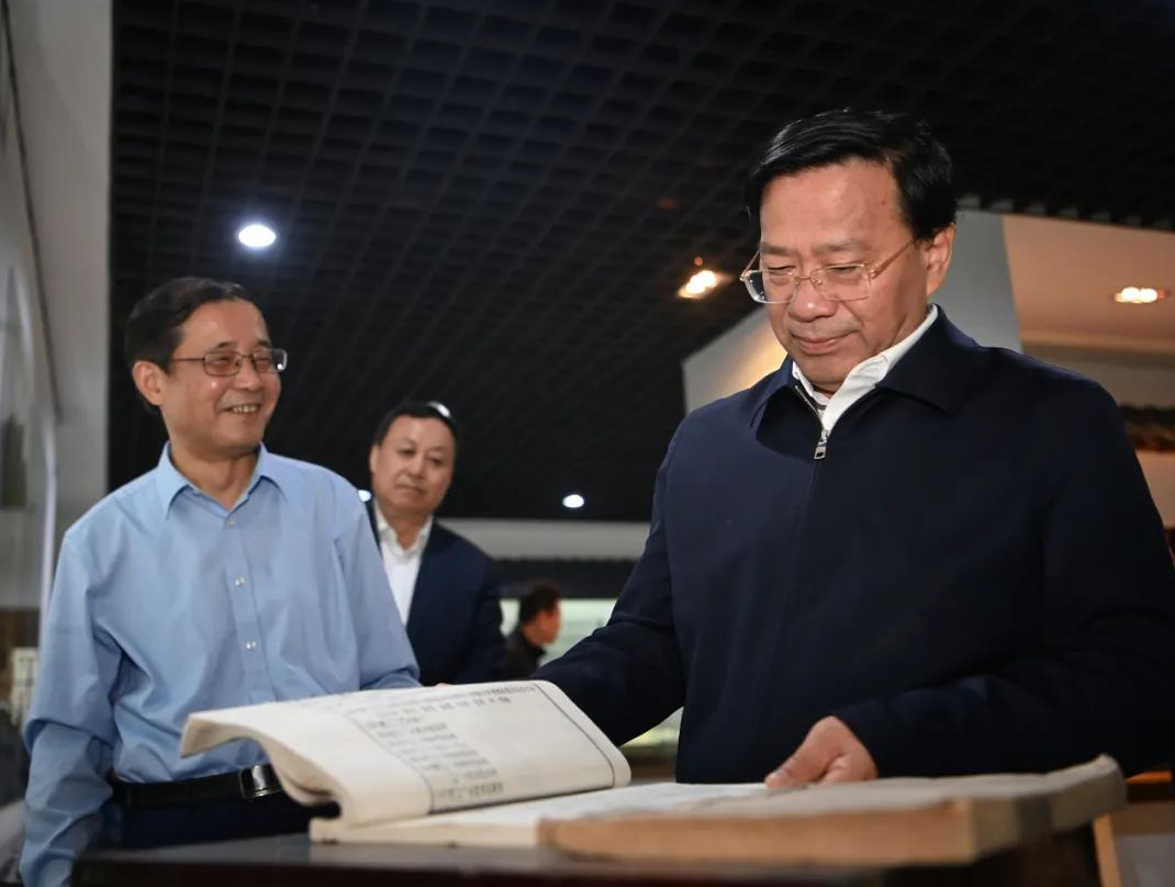 安徽大学徽学研究中心是教育部批准的首批十五个普通高等学校人文社会科学重点研究基地之一。韩俊走进中心察看徽州文书陈列室,与中心负责人亲切交流,深入了解徽学研究历程,他指出,徽文化是中华优秀传统文化的瑰宝和安徽优秀乡土文化的金名片,徽学很有影响力,与敦煌学、藏学并称为中国三大以地方命名的“显学”。他勉励中心加强徽学研究,提升研究站位,创新研究手段,潜心钻研,积极宣传推介,让更多人了解徽学关注徽学,让徽学在新时代发扬光大。他要求省直相关部门要实施徽学研究提升工程,推动安徽优秀传统文化创造性转化、创新性发展。