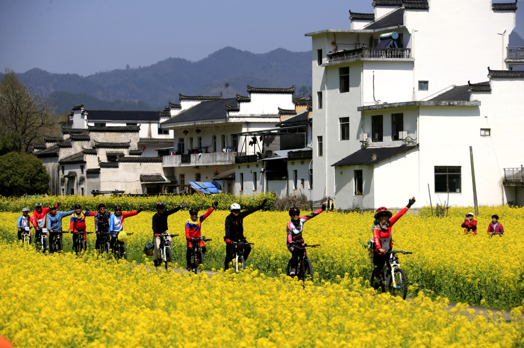 △今年3月,在黄山休宁县,一支骑行队伍经过齐云山脚下的油菜花田。