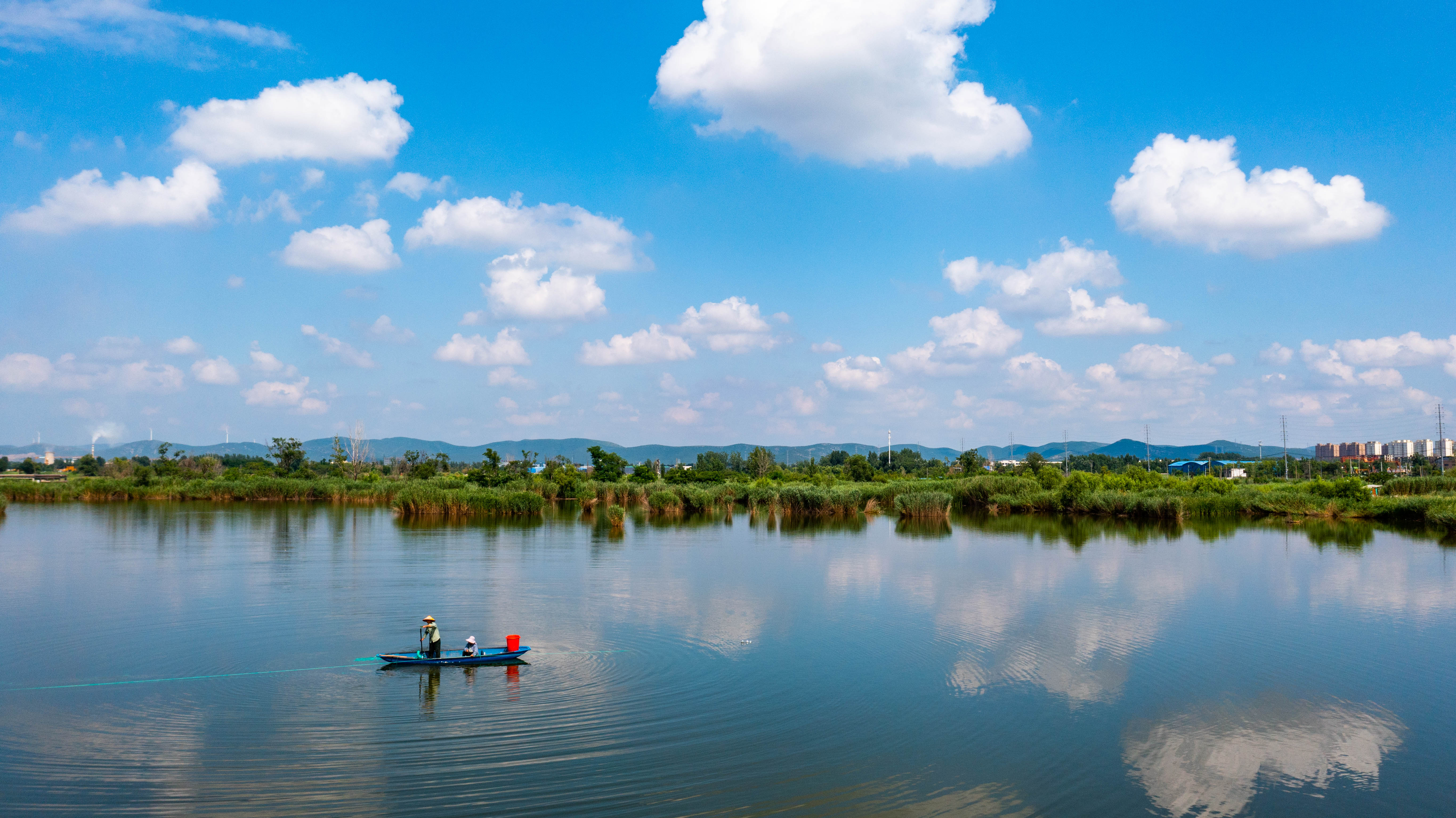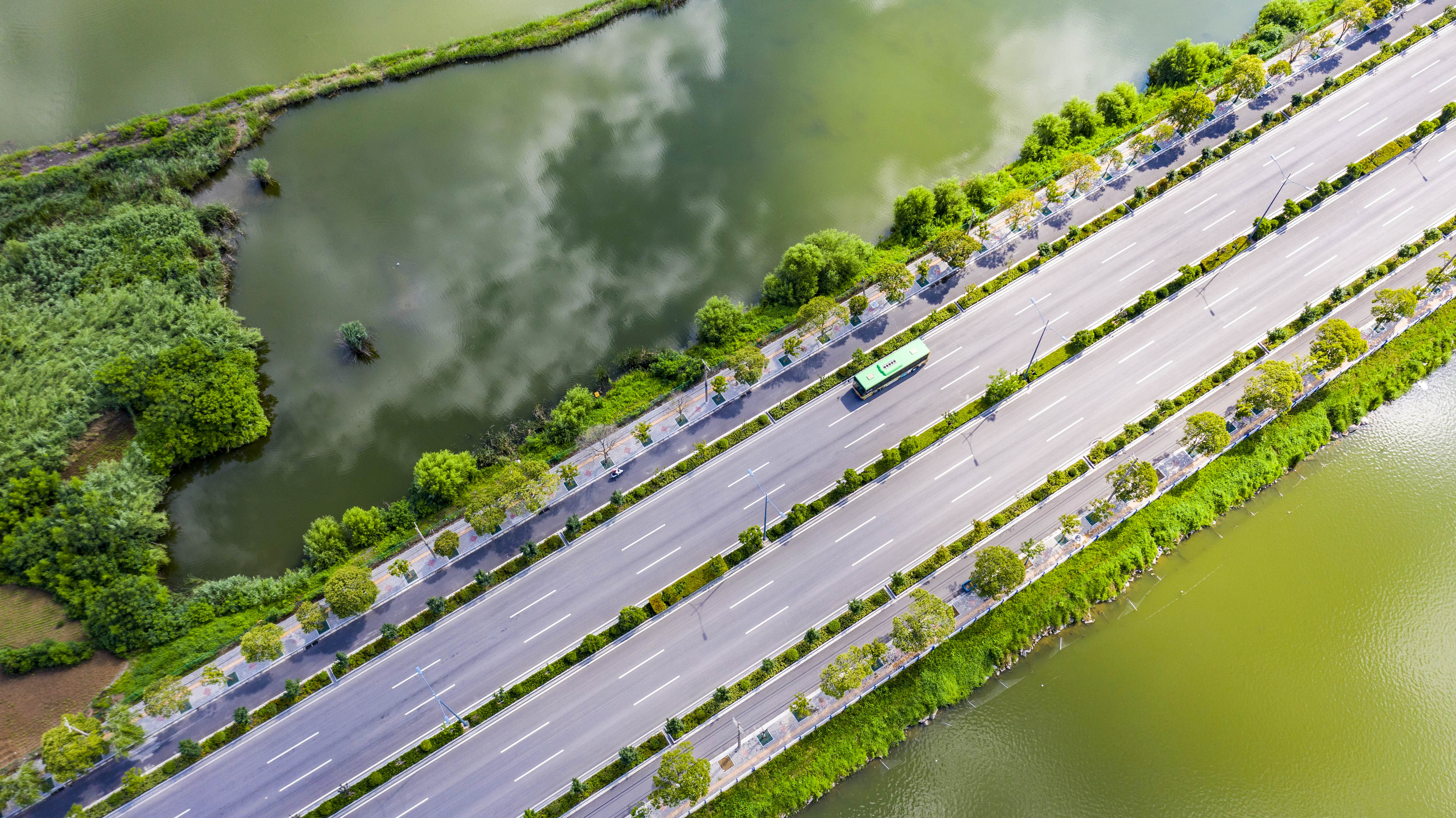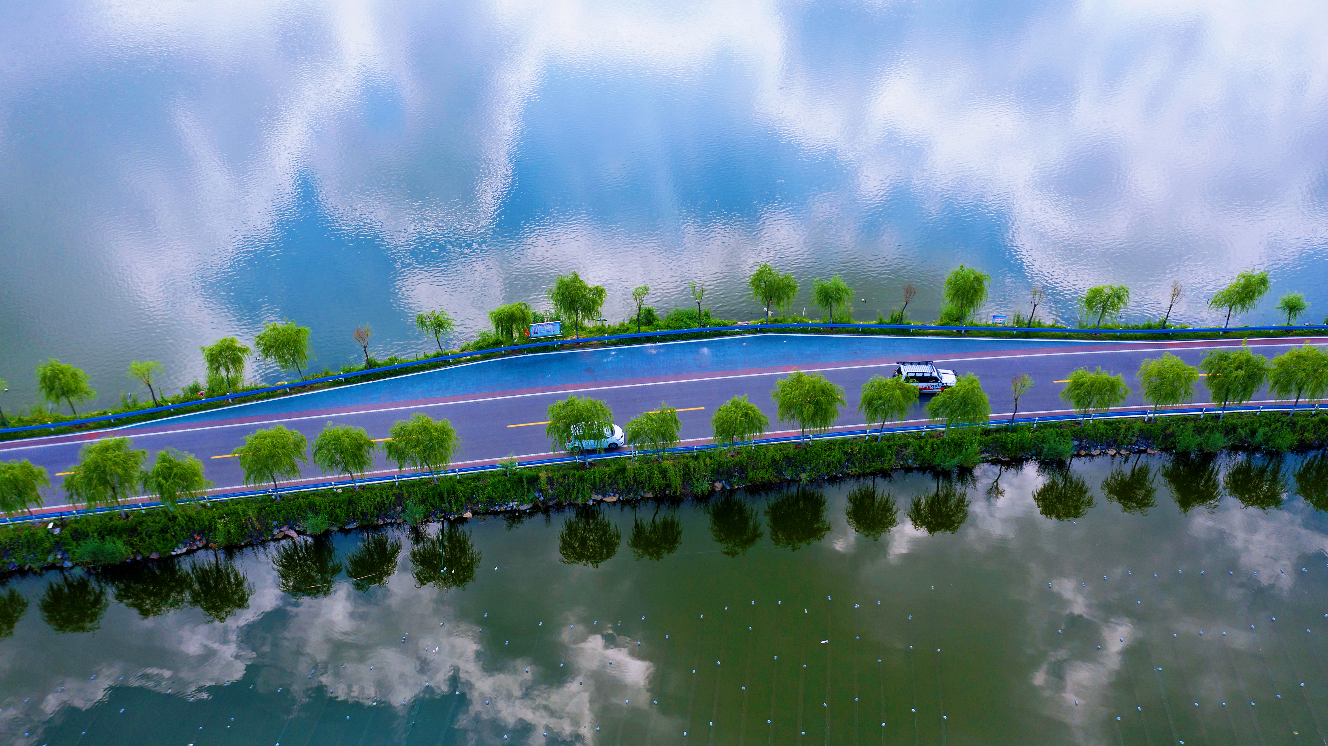 6月26日,在安徽省淮北市杜集区辖内航拍的乡村公路,宛若穿梭在云中。当日,淮北地区天气晴好,杜集区的乡村公路与塌陷区的湖面蓝天白云倒映其中,呈现出水天路一景色,就像一幅幅美丽的画卷,让人们享受大自然的乐趣。
