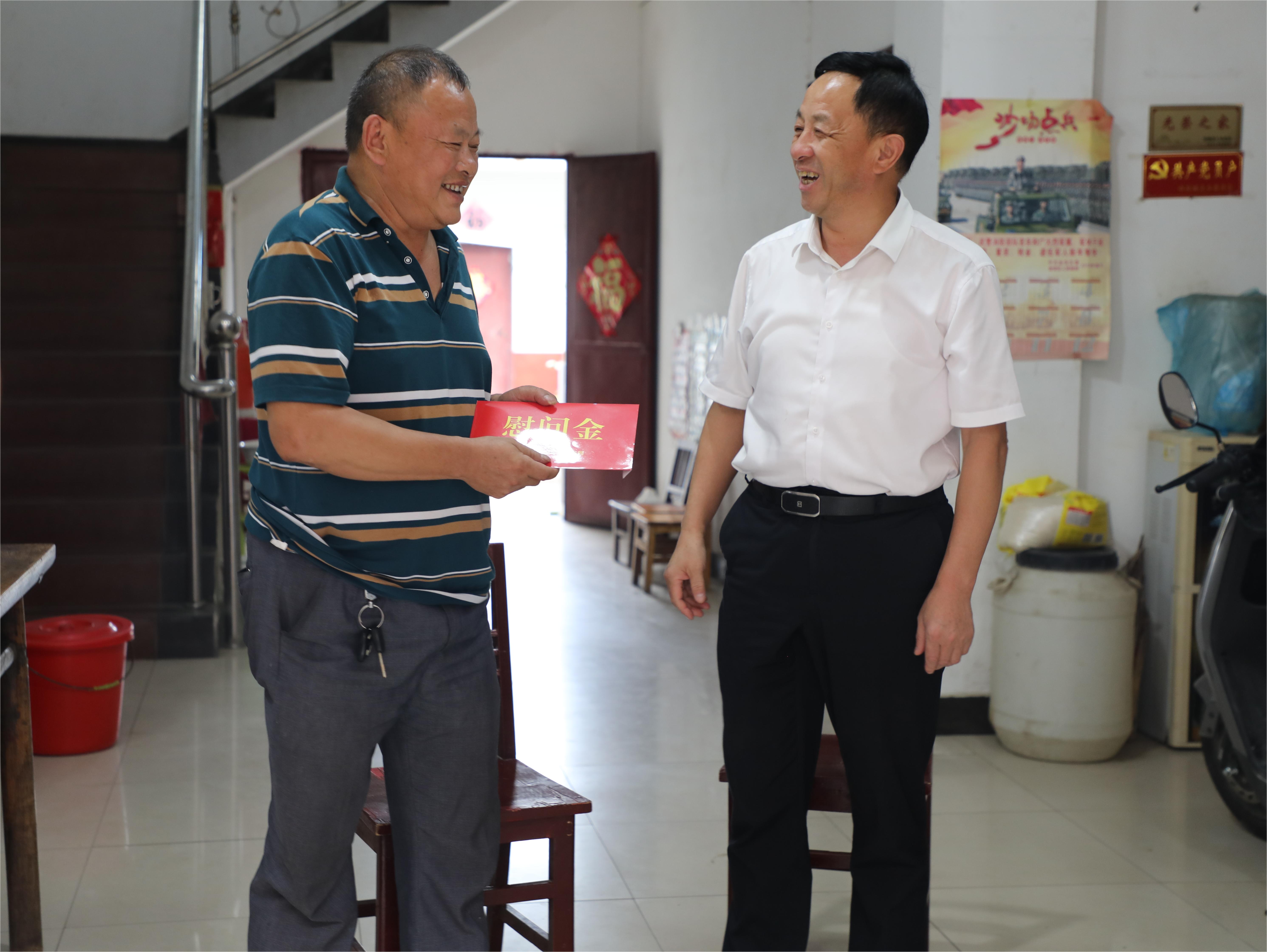 下午3时许,慰问组一行冒着大雨来到东河口镇毛岭村,看望慰问生活困难退役军人杨化友。杨化友今年72岁,是老党员,也是退役老兵,今年3月因交通事故受伤,目前还无法站立行走。慰问组与杨化友及其亲属亲切交谈,了解到其目前的身体康复情况及生活状况后,鼓励他要保持良好心态,安心调养身体,并表示党和政府永远是他坚强的后盾。