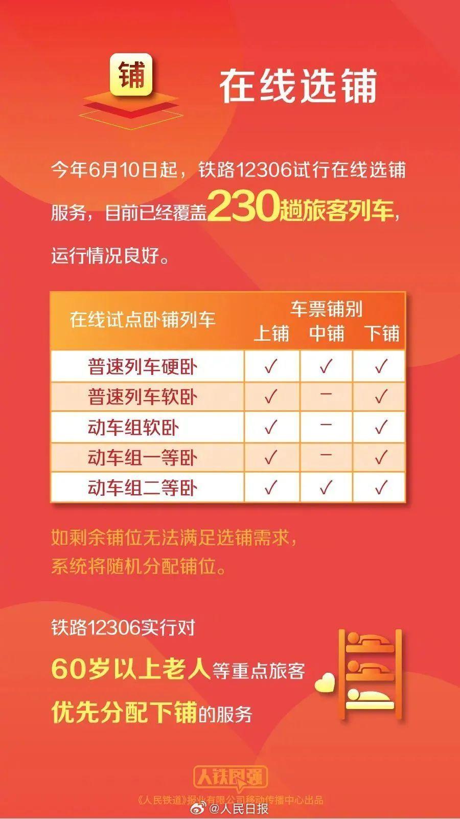 答:今年6月份,12306开始试行在线选铺服务,目前已经覆盖230趟旅客列车,运行情况良好。在线选铺服务提供了普速列车软卧、硬卧和动车组软卧、一等卧、二等卧等铺别的选择,这些铺别涵盖了不同层次的需求。同时,铁路12306仍然坚持对60岁以上老人等重点旅客优先分配下铺。