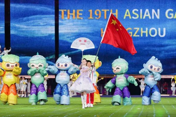 杭州亚运会闭幕式上,中国代表团旗帜、运动员入场。