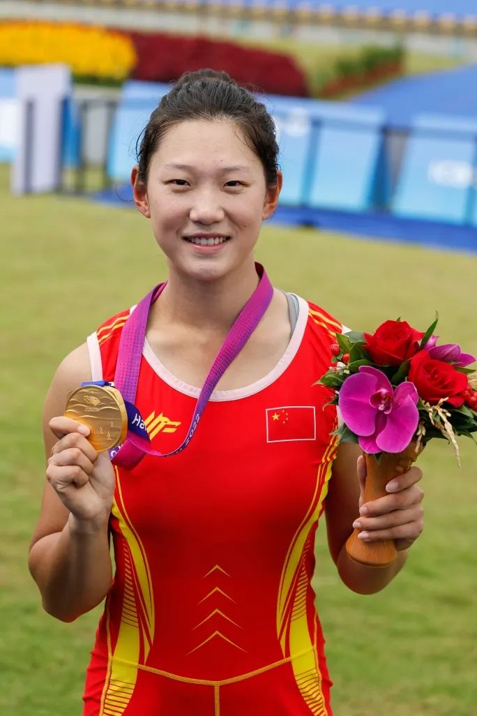 俞思源展示赛艇金牌。