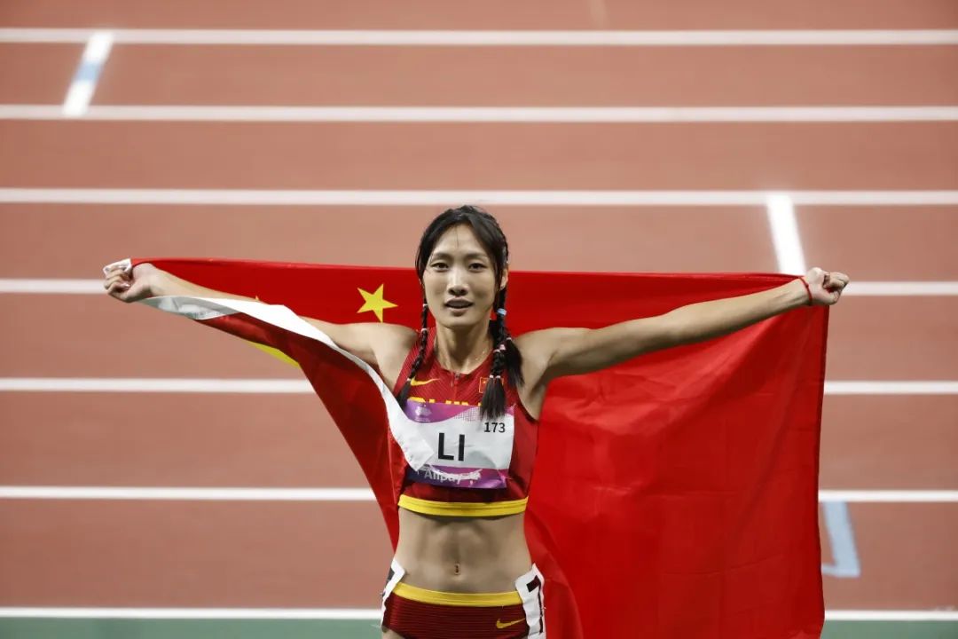 李玉婷获得田径女子200米银牌后庆祝。