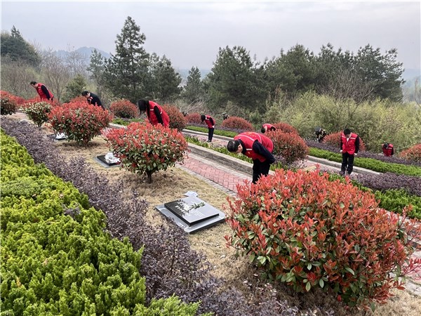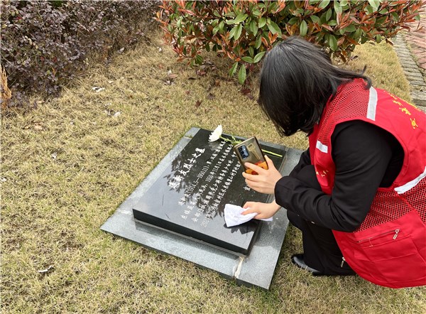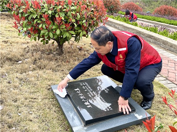 随后,大家缓步行至烈士集中安葬墓区开展“代祭扫”服务,向长眠于此的有名和无名烈士鞠躬致敬,擦拭墓碑、敬献鲜花,表达对英烈的哀思与怀念,告慰英烈忠魂。