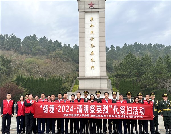 3月27日上午,宣城市、宣州区退役军人事务局、宣城市老兵国旗护卫队、烈属代表等40余人,在宣城市烈士陵园举行“铸魂·2024·清明祭英烈”代祭扫活动,为身在异地、行动不便的烈士亲属、社会各界群众提供“四个一”,即擦拭一遍墓碑、敬献一束鲜花、拍摄一组照片、给烈属打一通电话代祭扫服务。