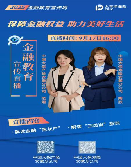 为贯彻落实国家金融监督管理总局关于开展2025年“金融教育宣传周”活动部署,中国太保产、寿险安徽分公司联合成立了“三适当”先锋宣讲团和“打击黑灰产”联合行动队,并于9月17日联合举办以“保障金融权益,助力美好生活”为主题的公益直播活动。本次直播聚焦“打击金融‘黑灰产’”与“落实‘三适当’原则”两大核心内容,通过专业解读、案例剖析与互动答疑等形式来科普金融知识。直播期间吸引了1万余人次观看,有效提升了公众金融素养与风险防范能力。