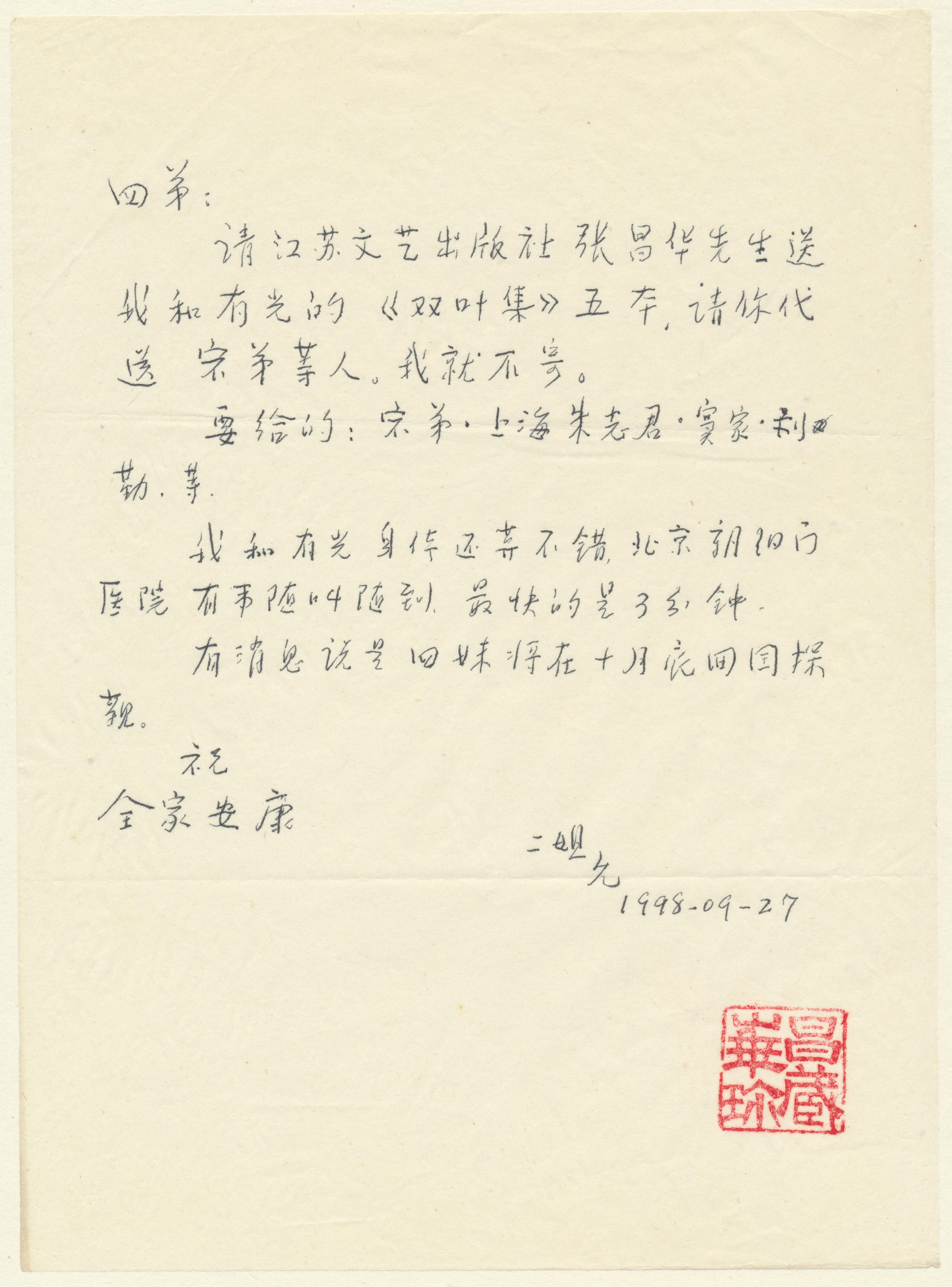 请江苏文艺出版社张昌华先生送我和有光的《双叶集》五本,请你代送寰弟等人。我就不寄。