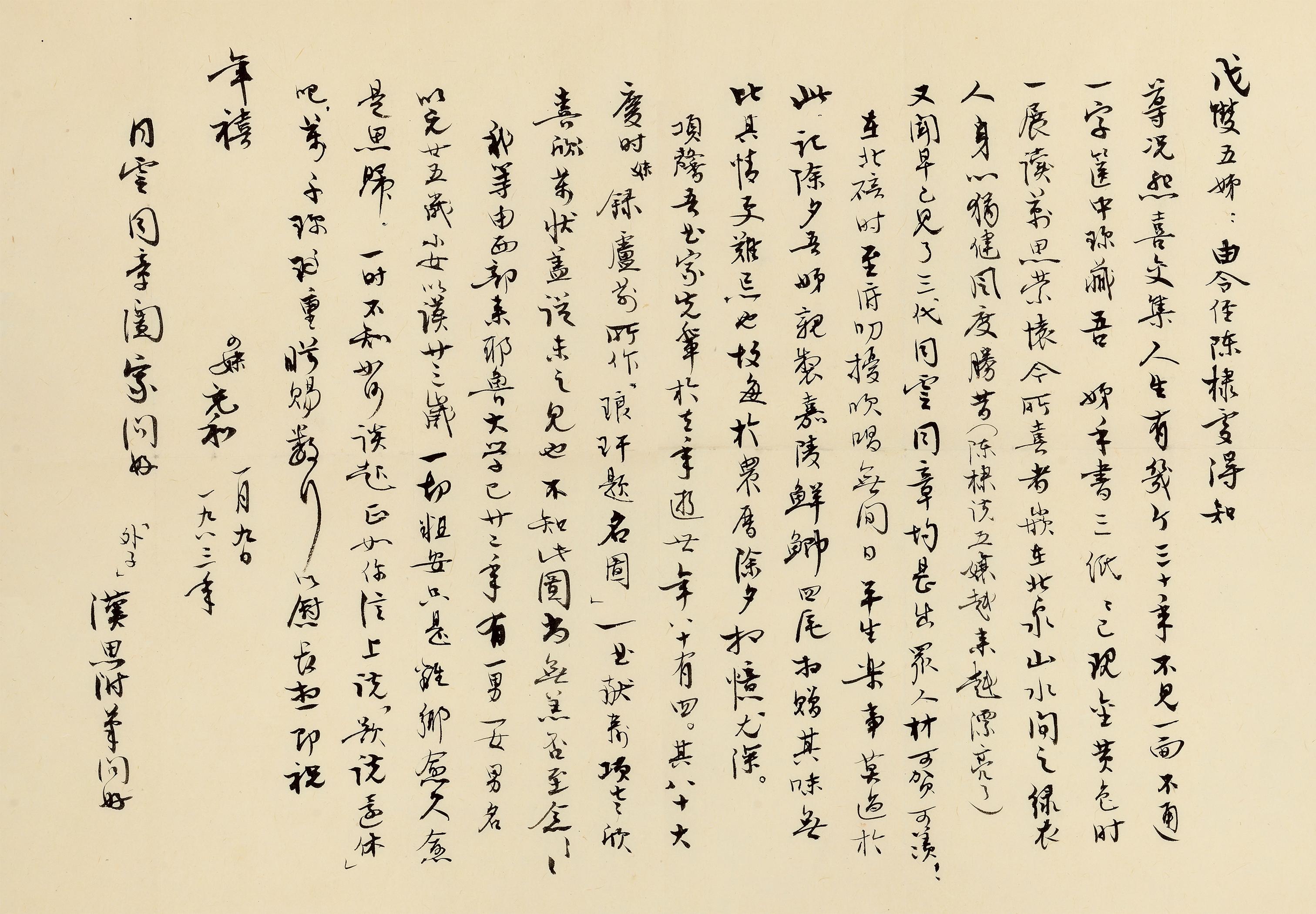 由令侄陈棣处得知尊况,悲喜交集。人生有几个三十年,不见一面,不通一字。箧中珎藏吾姊手书三纸,纸已现金黄色,时一展读,万思萦怀。今所喜者,嵌在北泉山水间之绿衣人,身心犹健,风度胜昔(陈棣说五孃越来越漂亮了)。又闻早已见了三代,同云、同章均甚出众人材,可贺可羡!