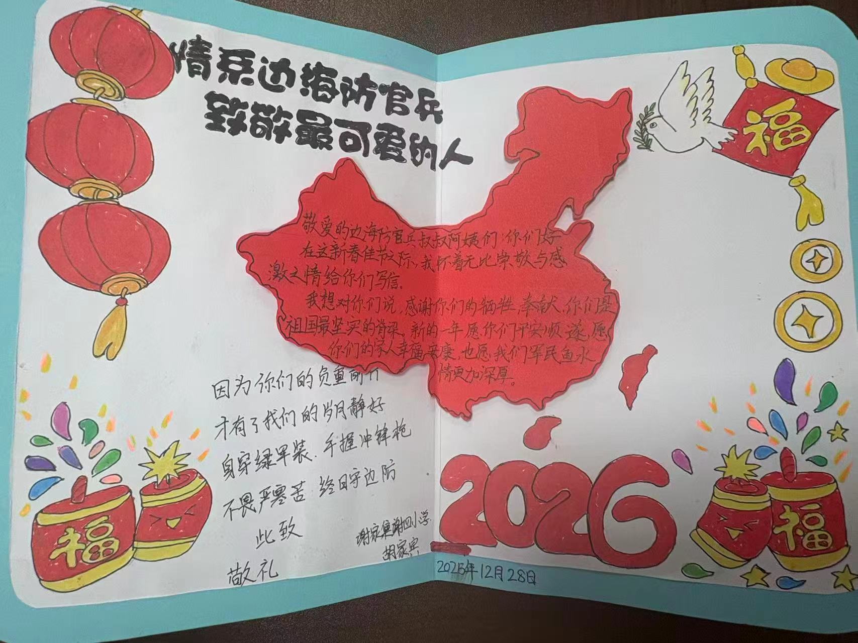 活动发起后,学生们踊跃参与,纷纷化身“小小拥军使者”,将对边海防官兵的崇敬与祝福倾注于笔端、描绘在纸上。孩子们或认真书写书信,用质朴的语言讲述“我心中的戍边英雄”,诉说“有你们守护,我们才拥有安稳校园”的真切感悟,赞颂官兵们不畏严寒、坚守岗位的牺牲奉献精神;或精心制作贺卡,用五彩画笔勾勒出界碑旁的挺拔身影、雪山上的橄榄绿,搭配红彤彤的灯笼、寓意吉祥的醒狮对联,让每一张卡片都成为独一无二的暖心礼物。“解放军叔叔,你们是祖国的移动界碑,新春快乐,愿你们平安顺遂!”“感谢你们用青春守护万家团圆,我会好好学习,将来也要为祖国站岗!”字里行间满是童真与敬意,笔画之间尽显军民同心,生动诠释了新时代的军民鱼水情。