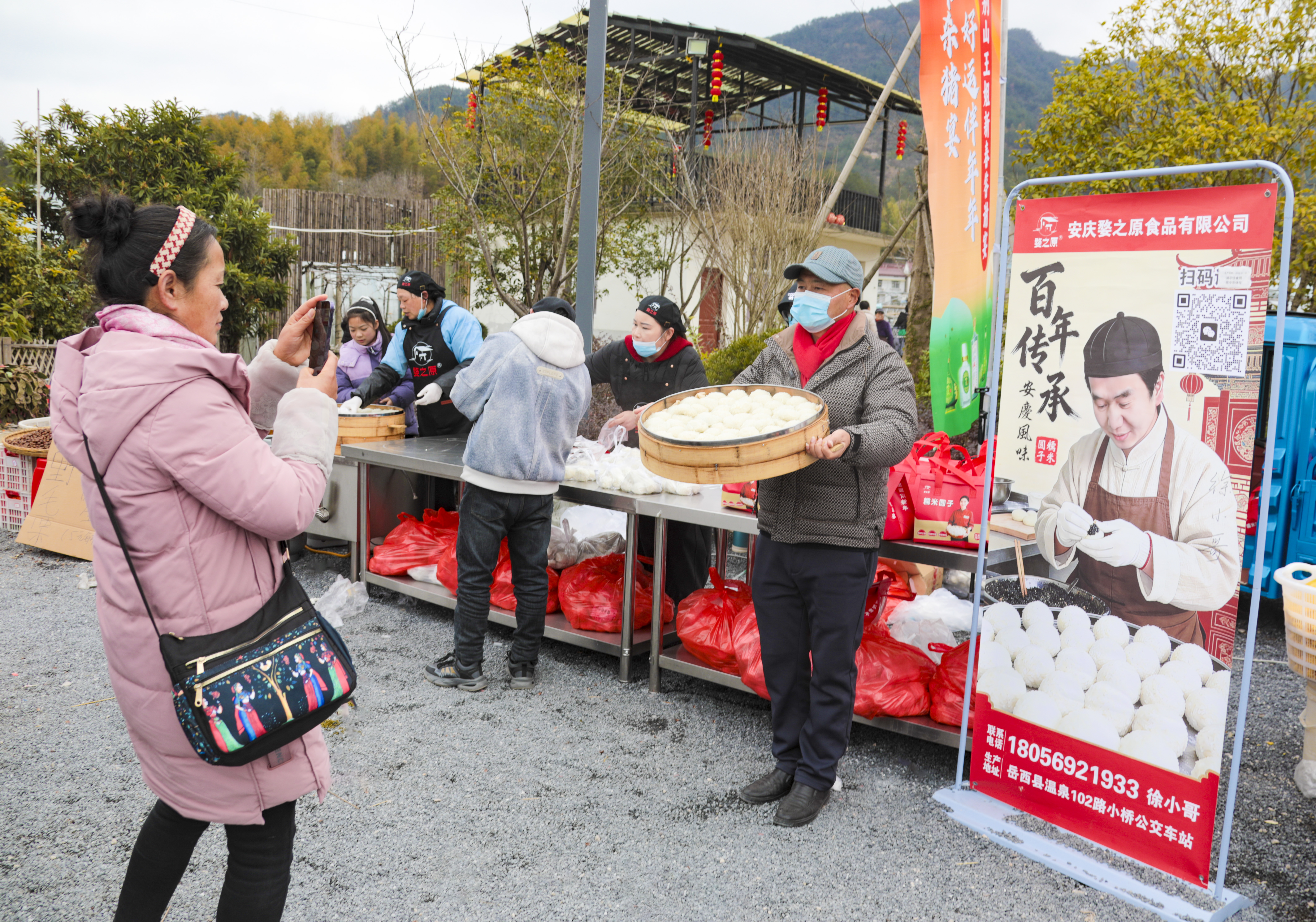 2月1日,岳西县毛尖山乡王畈村,村民和慕名而来的游客在吃“杀猪饭”,逛乡村集市。