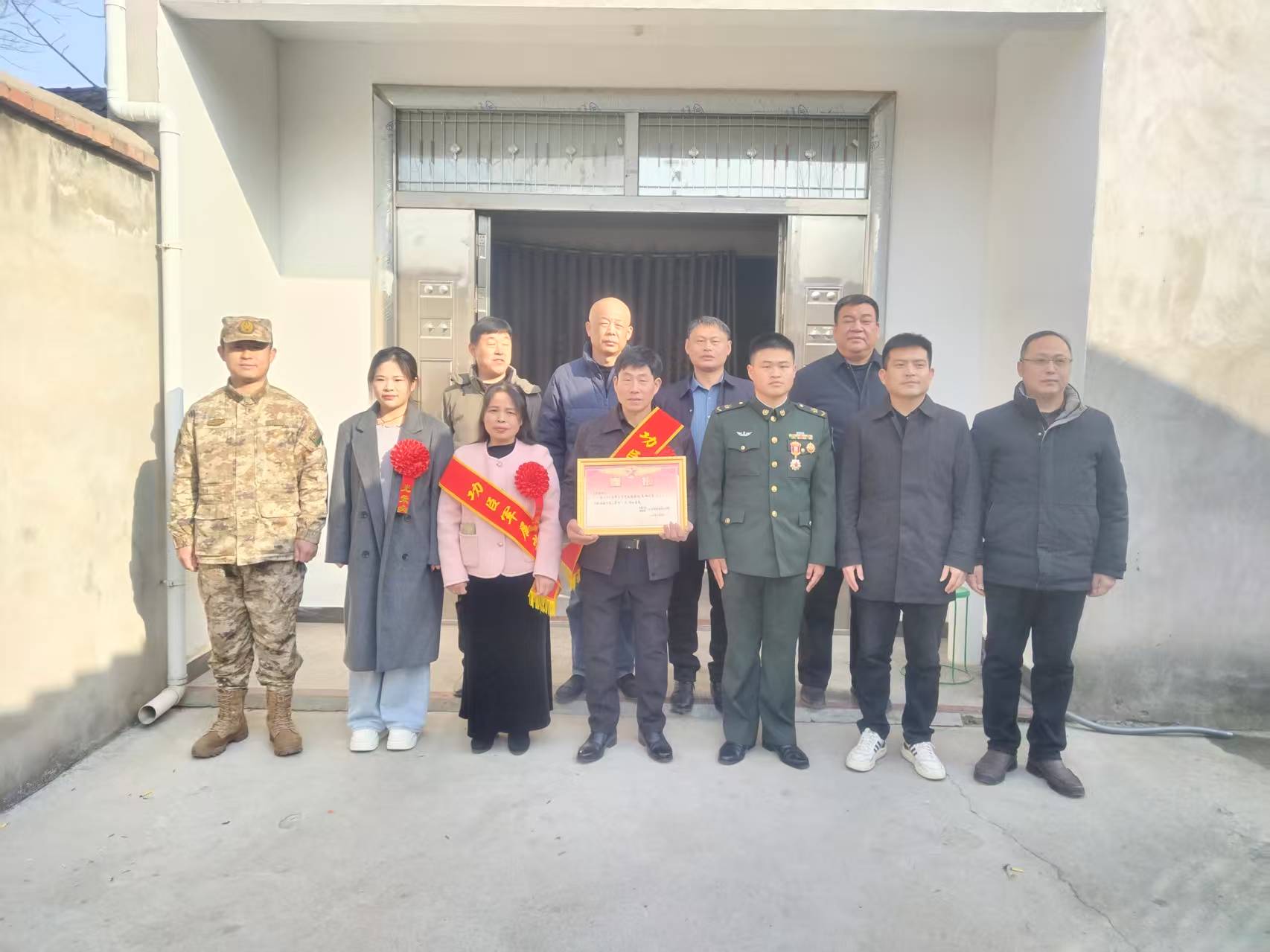 2月11日,由蒙城县人武部、蒙城县退役军人事务局及双涧镇政府等军地部门组成的慰问组,来到蒙城县双涧镇杨圩村现役军人李苏南家中,为其及家人送上二等功喜报。