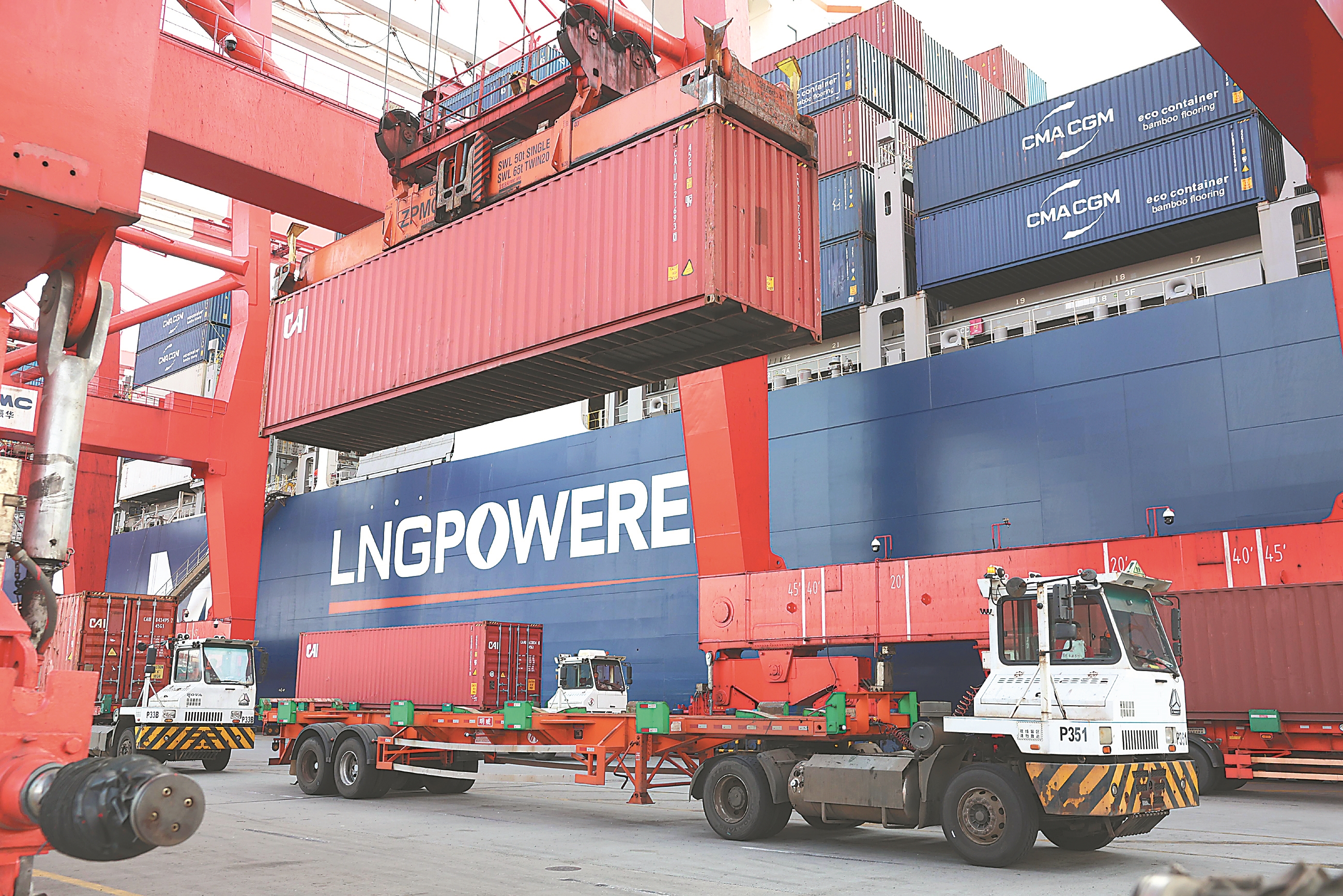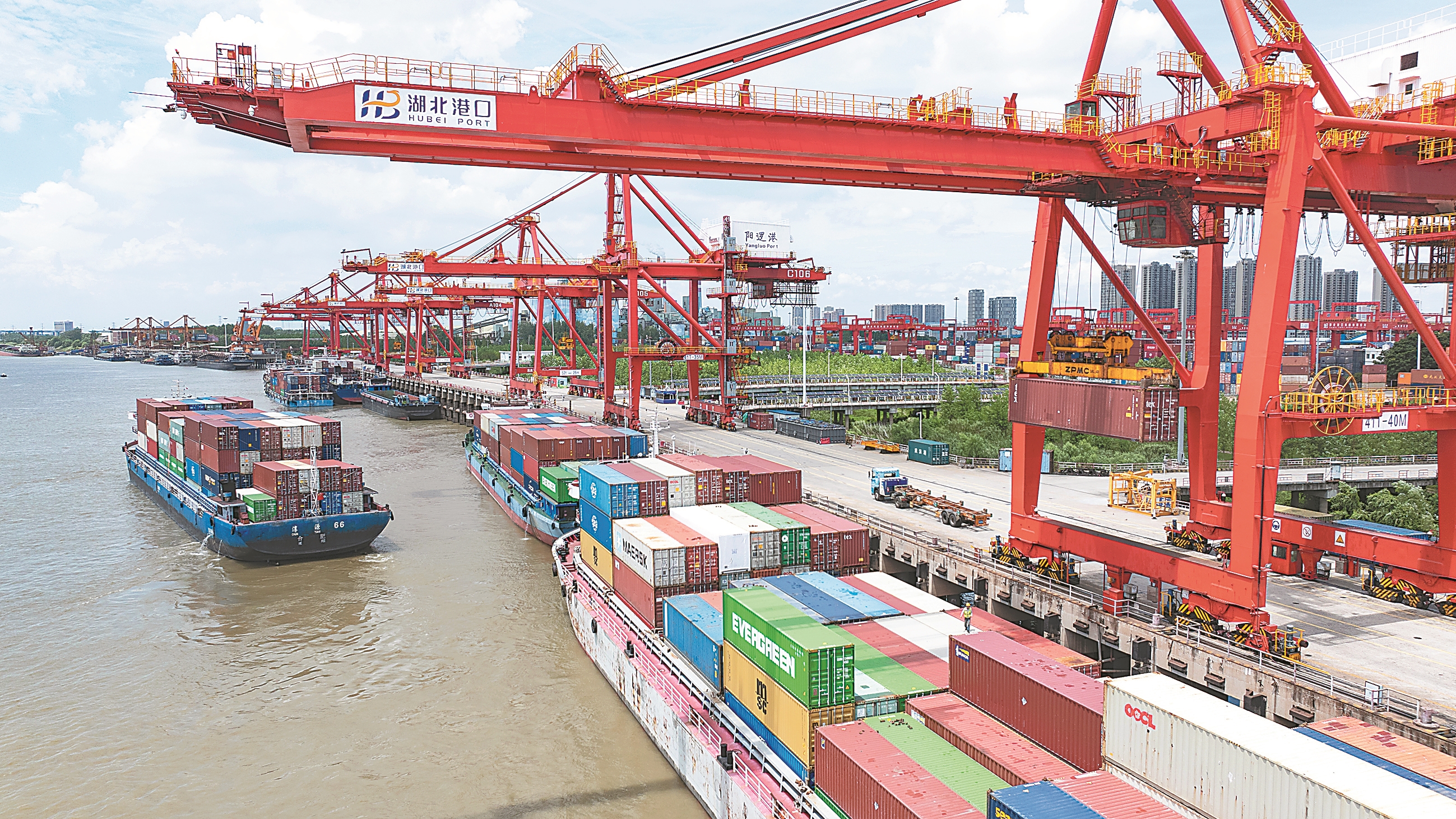 2月25日,武汉阳逻集装箱码头上,集卡车来回穿梭,龙门吊长臂舞动,装卸作业紧张有序,“华航汉亚5”轮整装待发,将通江达海驶往日韩。