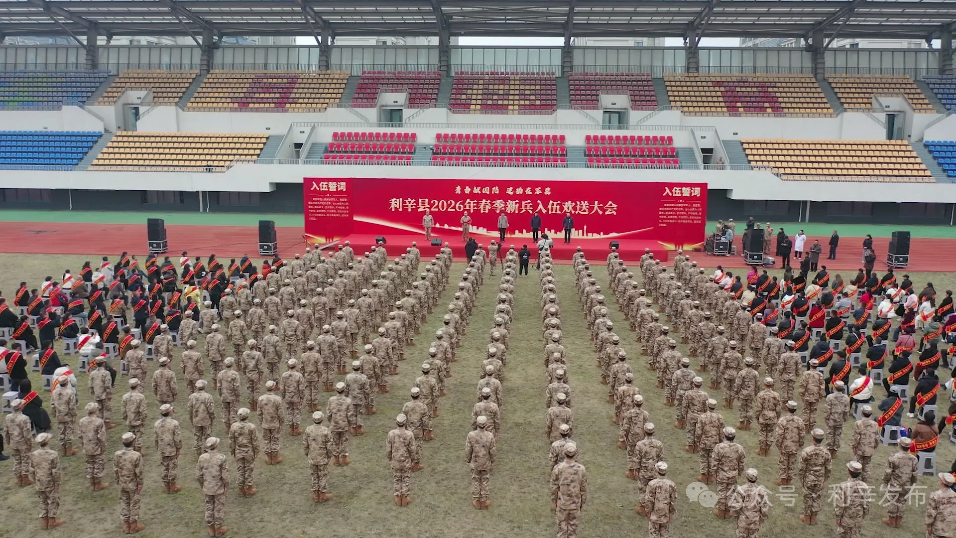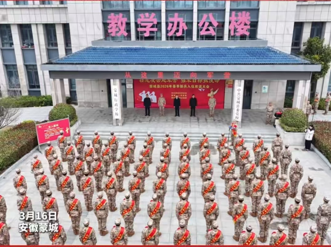 3月15日下午,利辛县2026年春季新兵入伍欢送大会在体育中心操场隆重举行。新兵身披绶带、胸戴红花,斗志昂扬、英姿飒爽,带着家乡人民的厚望与祝福,开启报效祖国的新征程。下午三点整,欢送大会在雄壮的国歌声中拉开帷幕。入伍新兵们戎装整肃、精神饱满、列队而立,胸前鲜艳的大红花格外醒目,每个人脸上都洋溢着自豪与期待。仪式上,全体新兵庄严宣誓,表达自己投身军营、报效祖国的坚定决心,铿锵有力的誓言回荡在广场上空。(李雷)