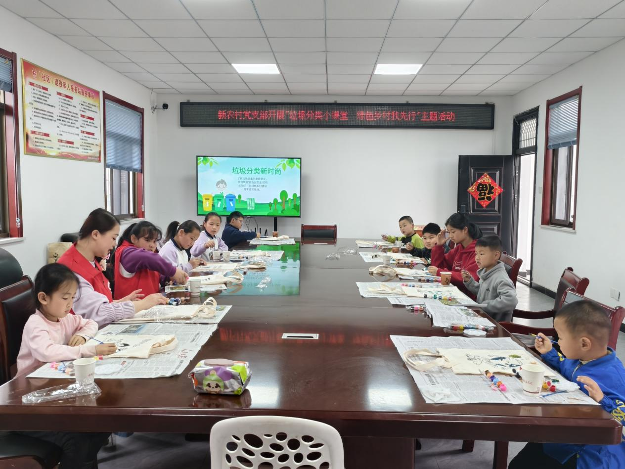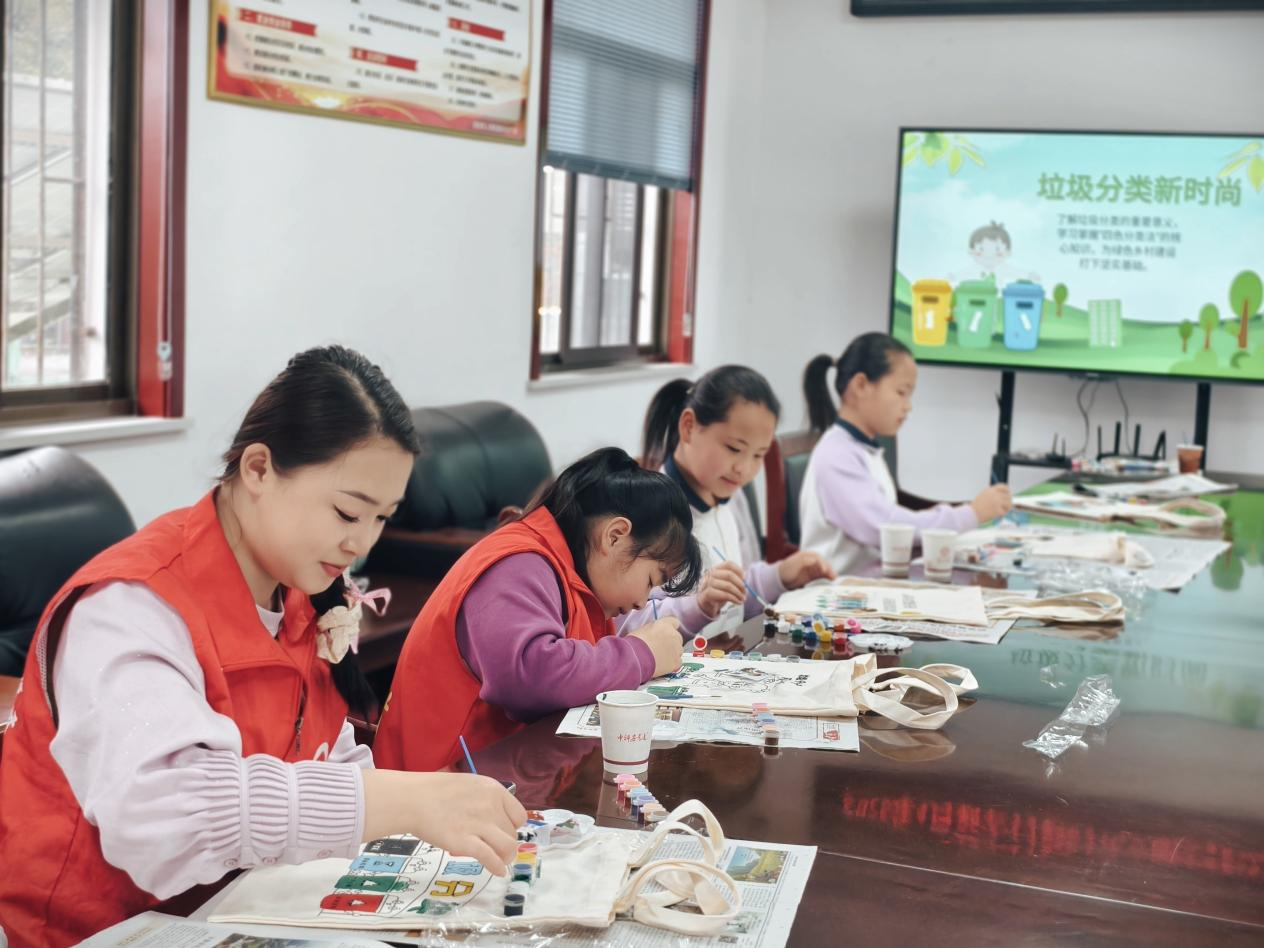 理论学习结束后,活动进入了孩子们最期待的动手实践环节。志愿者为每个孩子分发了手提袋和环保丙烯画笔,鼓励大家把刚学到的垃圾分类知识,或是自己对绿色乡村的想象画在手提袋上。孩子们围坐在长桌旁,纷纷化身“环保小设计师”,有的认真勾勒出四色垃圾桶的卡通形象,有的描绘出蓝天白云掩映下的青山绿水,还有的直接在袋子上写下“垃圾分类从我做起”的标语。志愿者在旁来回指导,时不时帮忙调整配色、出出主意,现场始终欢声笑语不断,一个个满载童趣与创意的环保手提袋也渐渐成型。