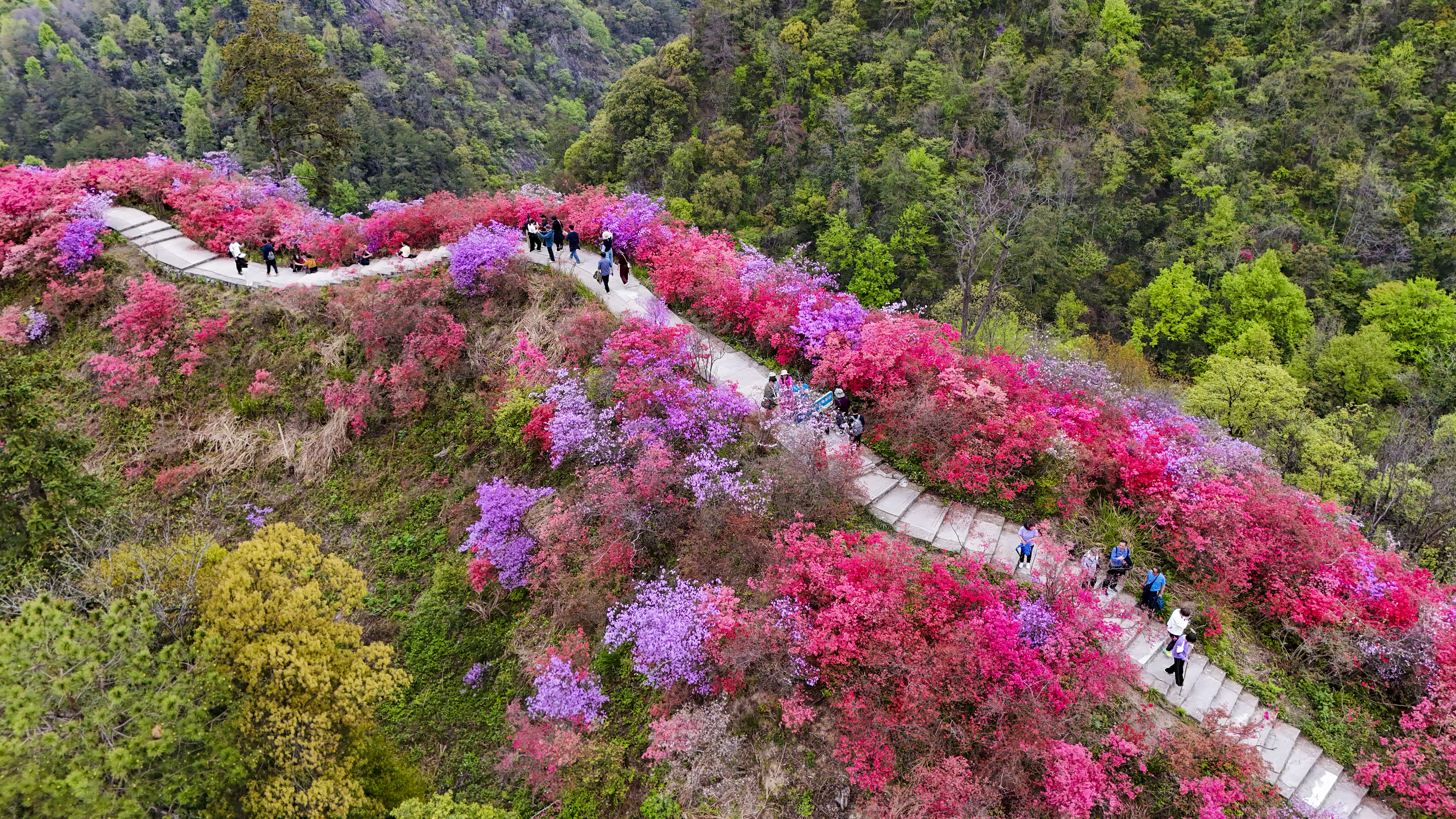 4月6日,清明假期,岳西县河图镇天峡风景区内,千亩野生高山杜鹃迎来最佳观赏期,吸引游客前来赏花度假。漫山遍野的杜鹃花海沿山脊铺展,红、粉、紫、白各色花朵竞相绽放,将大别山腹地装点成一幅绚丽的春日画卷。(熊凤霞)