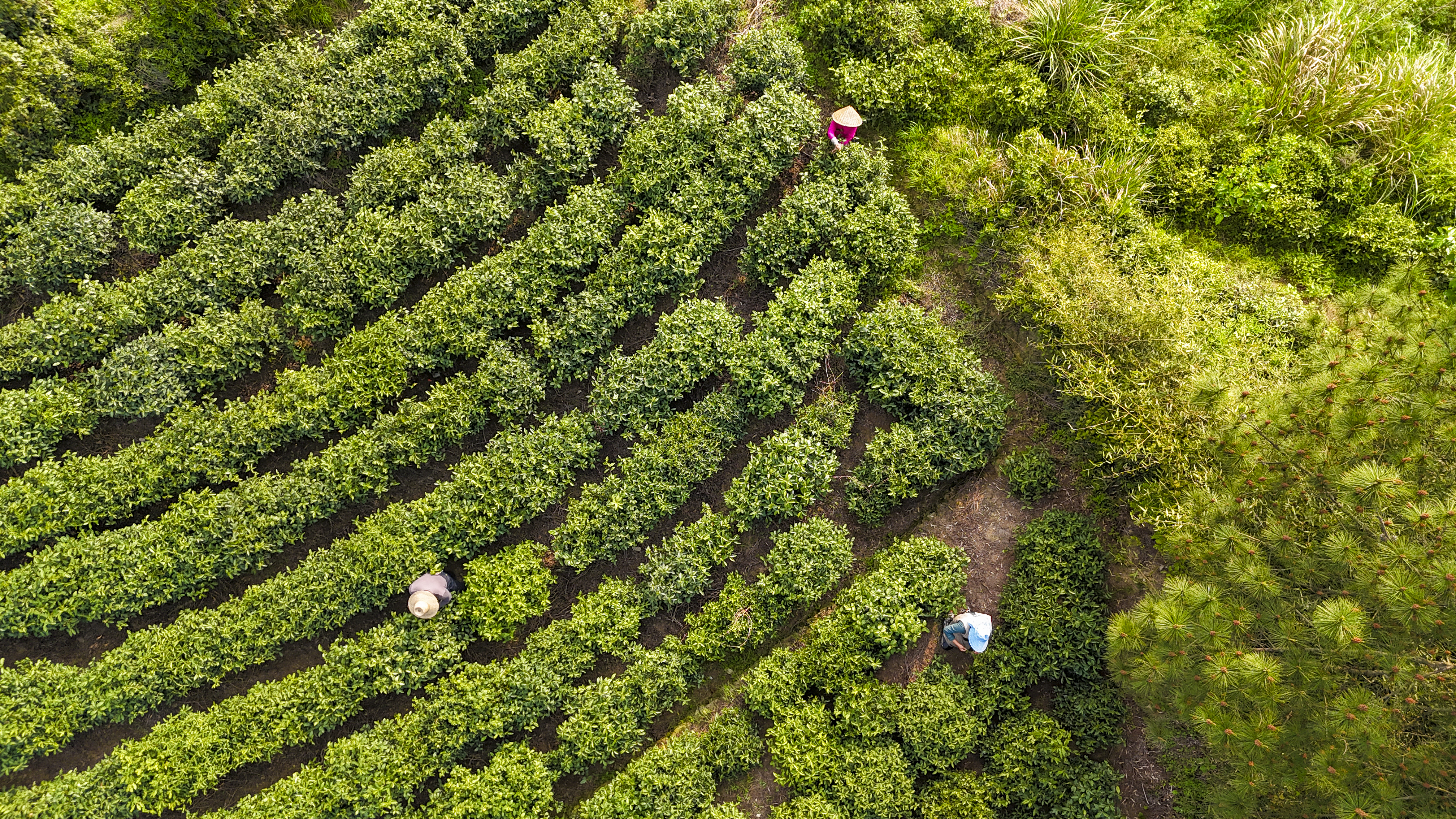 4月19日,岳西县毛尖山乡林河村天堂湖畔,茶山翠绿,湖光粼粼,采茶人穿梭其间,构成一幅美丽的春日生态画卷。(熊凤霞)