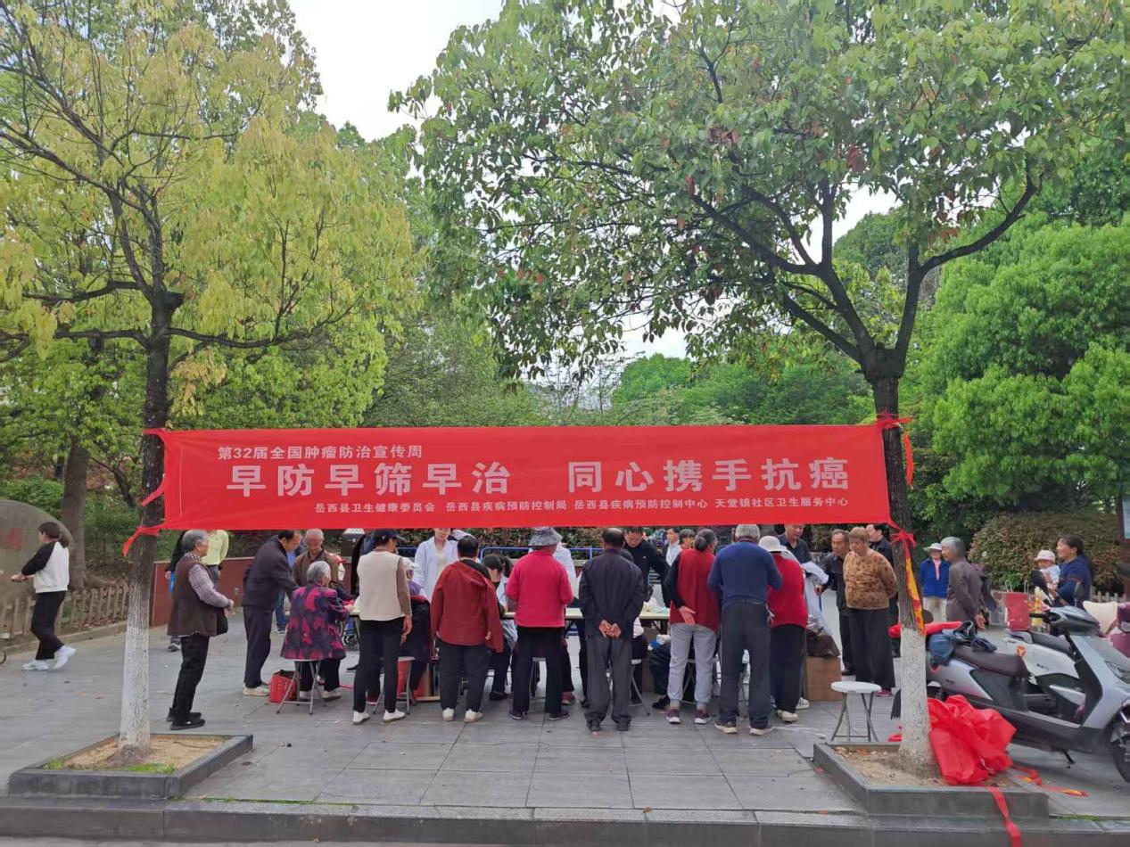2026年4月15日至21日是第32个全国肿瘤防治宣传周,宣传主题为“早防早筛早治 同心携手抗癌”。4月17日下午,岳西县卫健委联合县疾控中心、天堂镇卫生院,在竹篙尖公园及天堂镇城东社区开展系列宣传活动,普及肿瘤防治知识,提升全民防癌抗癌意识。