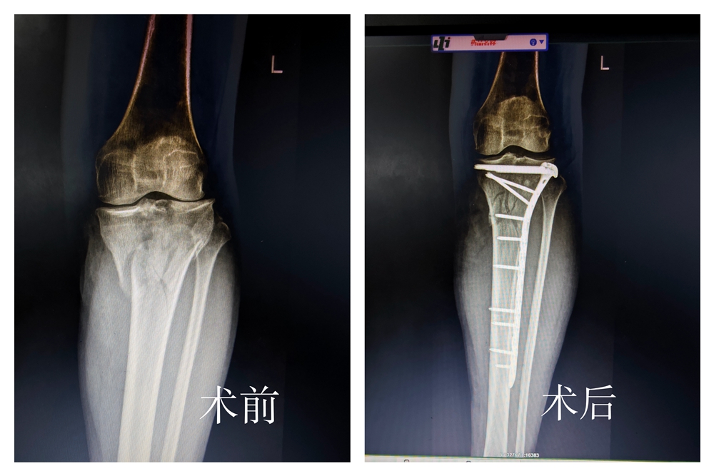 入院后,陈美富医生急诊清创后第一时间为患者完善检查,制定个性化治疗方案:患肢持续骨牵引外固定制动,予以消肿止痛等对症处理。待局部肿胀明显消退、身体条件符合手术标准后,于4月6日在会诊麻醉下,顺利为患者实施“左侧胫骨平台骨折切开复位内固定+植骨术”。术中钢板植入位置精准,术后复查影像显示骨折复位满意。