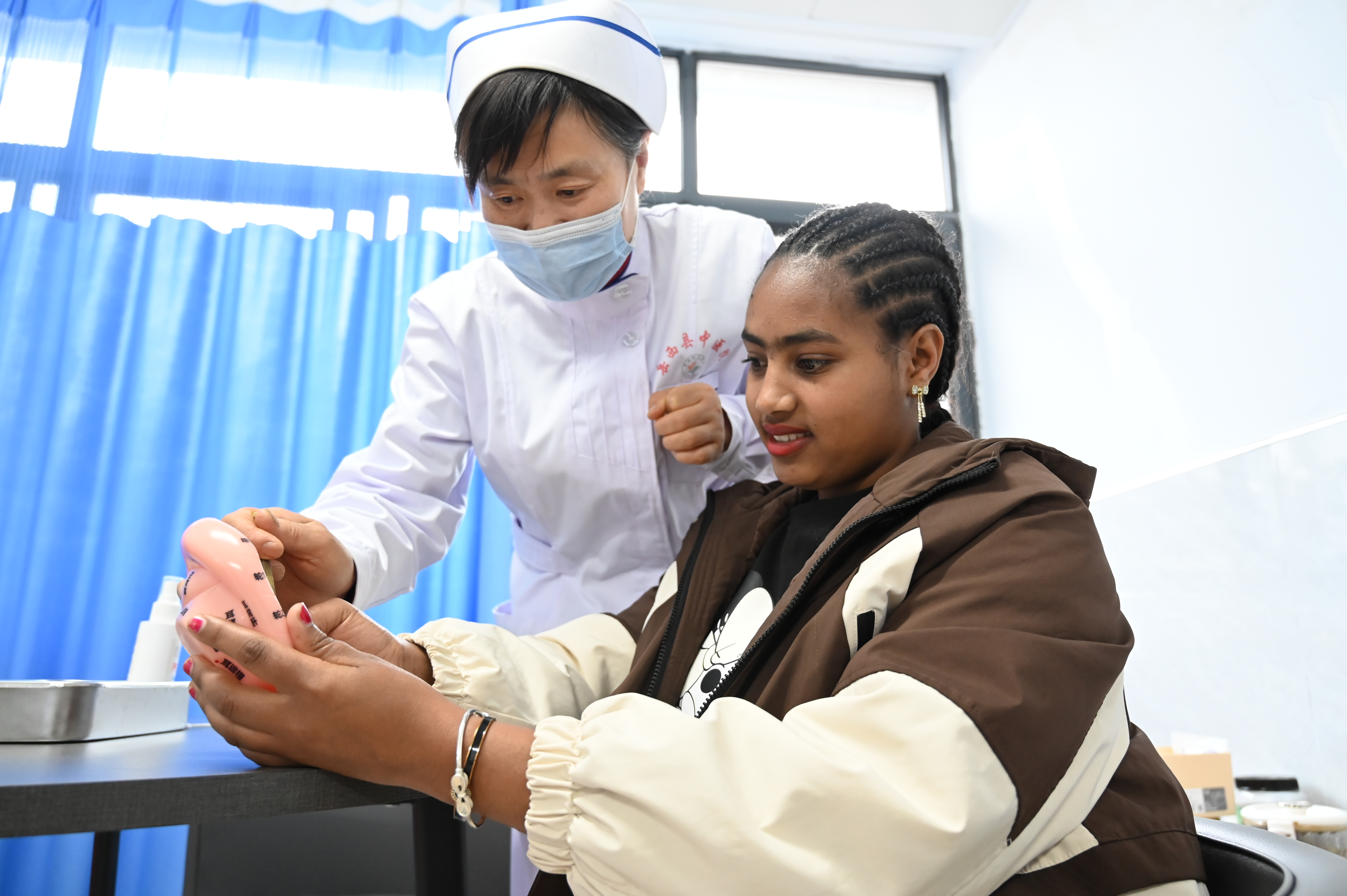 4月21日,岳西县中医院中医诊室内,一位埃塞俄比亚友人正沉浸式体验中医特色疗法——耳穴压豆,近距离感受中医药文化的独特魅力。