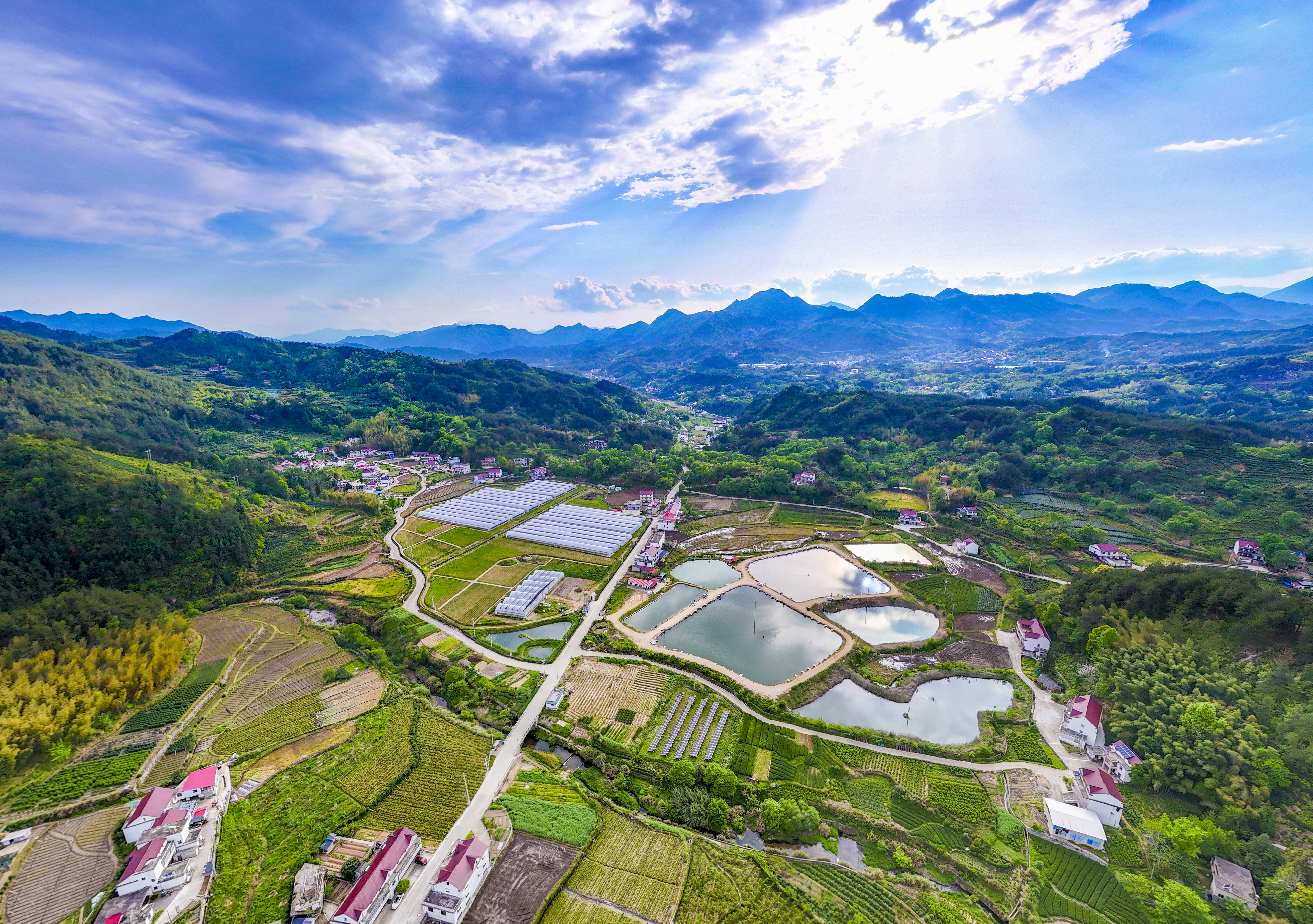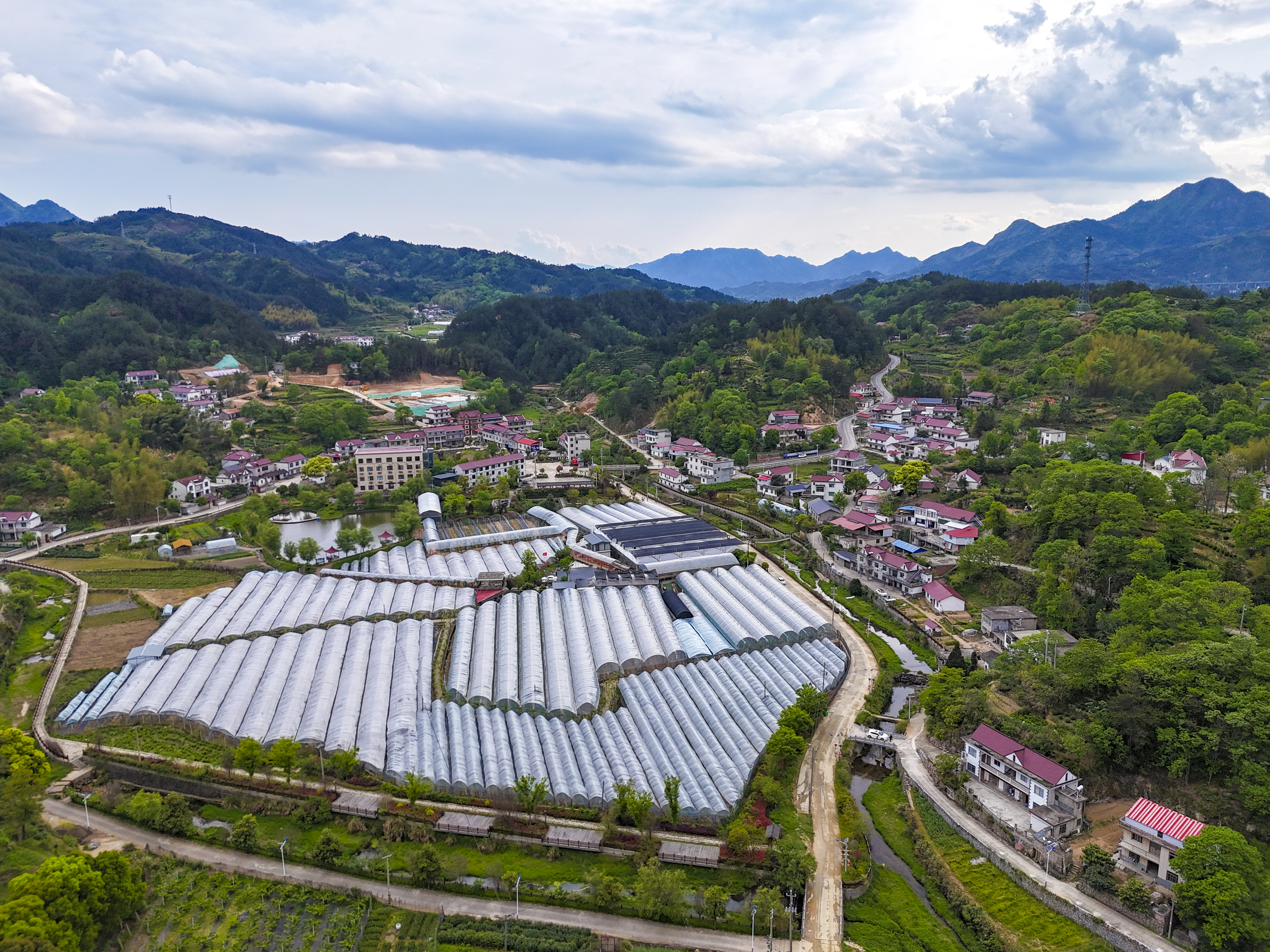 4月25日,岳西县毛尖山乡王畈村,葡萄大棚、养殖基地与青山、村庄、道路交相辉映,构成一幅新时代美丽乡村新画卷。(熊凤霞)